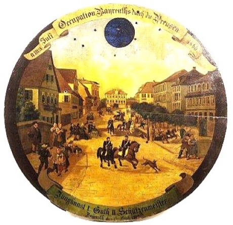 Diese Scheibe (Öl/Holz) stammt vom 1. Sept. 1867 und stellt – als Zeitdokument – die „OCCUPATION BAYREUTHS DURCH DIE PREUSEN“ am 28. Juli 1866 in der Bahnhofstraße dar.